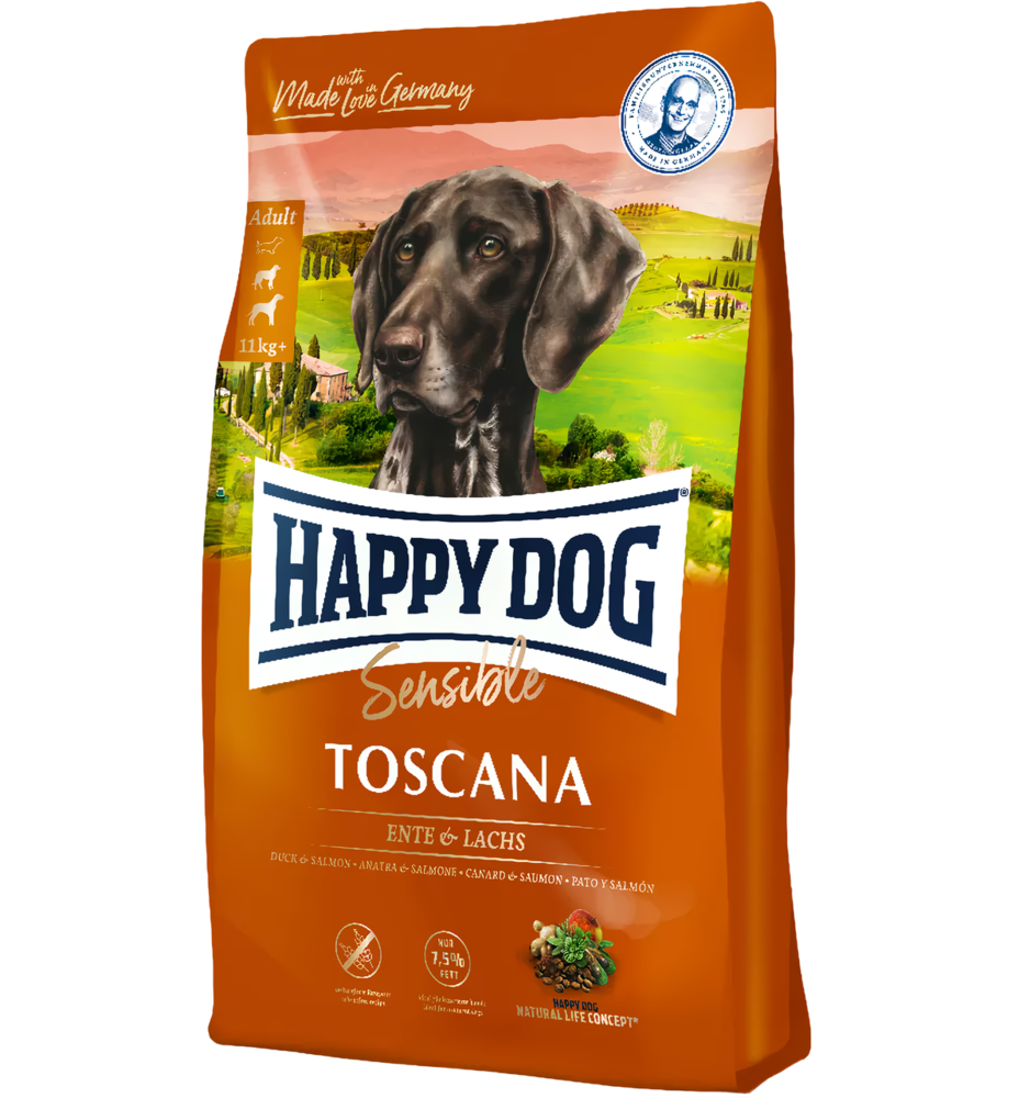Корм Happy Dog Тоскана відмінно підійде собакам з чутливою травною системою. Кількість високоякісних протеїнів в кормі – не менше 24%, а вміст жирів знижено до 7,5%, таким чином, раціон підійде собакам зі заниженими потребами в енергії, в т. ч. кастрованим. Happy Dog Supreme Toscana містить всі необхідні собаці поживні речовини, а вітаміни і мінерали підтримують захисні сили організму, роблячи собаку красивою, здоровою і життєрадісною.