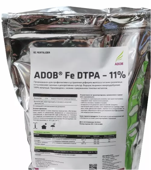 ADOB® Fe DT PA – 11% – це спеціальне добриво, спеціально розроблене для постачання рослин високодоступними катіонами заліза за трохи більш високих умов pH (6,5–7,5). Завдяки запатентованому виробничому процесу ADOB® Fe DT PA – 11% характеризується низкою унікальних властивостей. Вся концентрація заліза в продукті (11% мас./мас.) на 100% хелатується ДТ ПА., що робить його повністю ефективним і доступним для рослин. Добриво є повністю розчинними у воді сипучими мікрогранульами без будь-яких домішок або пилу. Завдяки «малинової» формі мікрогранул продукт не гігроскопічний і саморозчинний, не потребує змішування. Розчинність продукту становить 800 г/л при 20 o C. Оскільки в процесі виробництва не використовуються сульфати, хлориди або нітрати, матеріал не містить аніонів. Цей продукт є ефективним джерелом заліза при внесенні безпосередньо в ґрунт і при внесенні за допомогою фертигації або гідропоніки. Рекомендується для профілактичного та коригувального добрива всіх сільськогосподарських та садових культур.