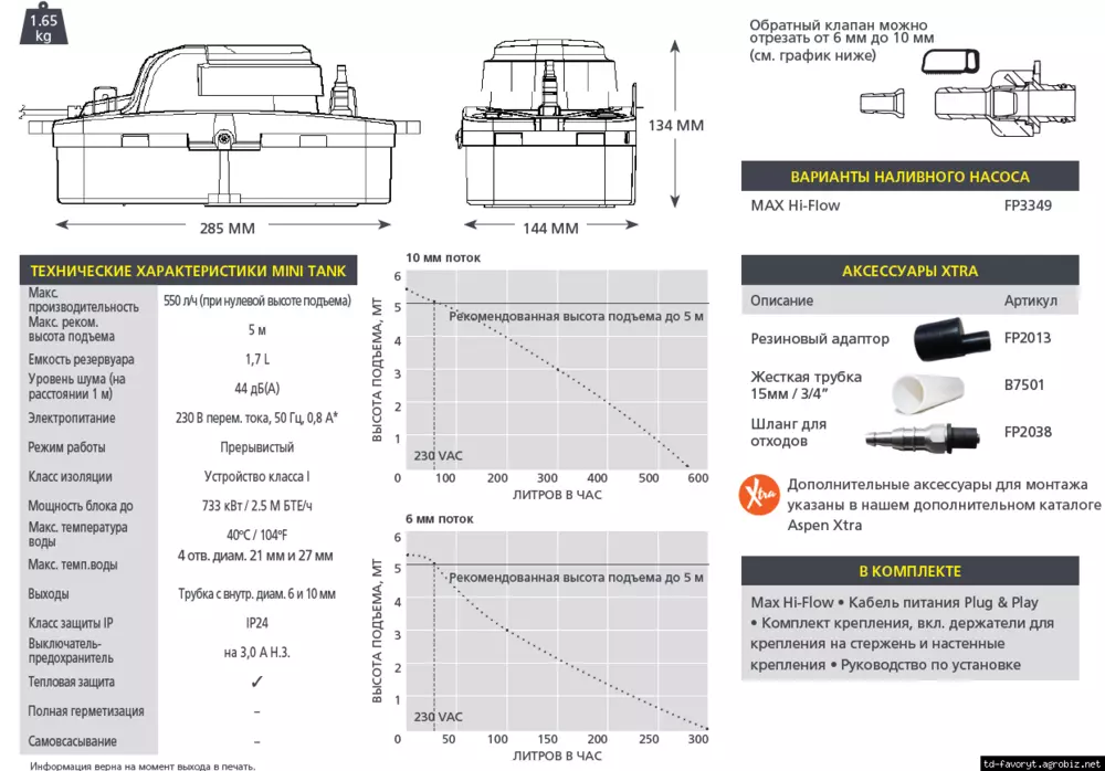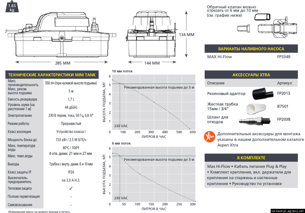 Питание 230 В АС, 75 Вт, макс. производительность до 550 л/час (при отсутствии подъема, см. диаграмму), макс. подъем до 5 м, размер насоса 144х285х134 мм.