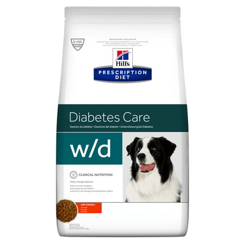 Hill's Prescription Diet w/d - повноцінний дієтичний раціон для дорослих собак для регулювання рівня глюкози в крові (при діабеті) і регулювання метаболізму жирів у випадках гіперліпідемії. Містить низький рівень жиру і глюкозосодержащіх вуглеводів і високий рівень незамінних жирних кіслот.Prescription Diet Canine w / d володіє наступними ключовими перевагами.