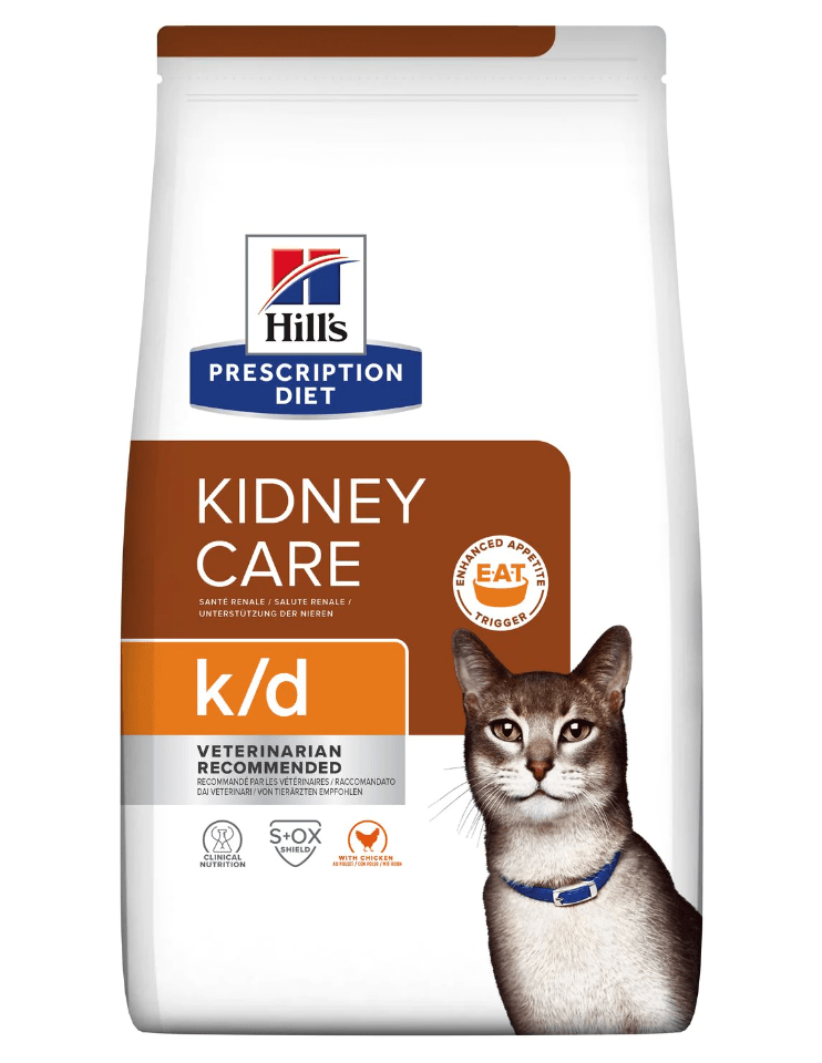 Hill’s Prescription Diet Kidney care k/d - повнораціонний дієтичний корм, що підтримує належне функціонування нирок у разі гострої та хронічної хвороби нирок у дорослих котів. Корм вирізняється низьким вмістом фосфору та обмеженим вмістом високоякісного білка, що допомагає у лікуванні хронічної хвороби нирок та уповільнює прогресування захворювання. Клінічно доведено, що сухий корм для котів Hill’s Prescription Diet із запатентованою технологією підвищення апетиту Enhanced Appetite Trigger (E.A.T.) посилює апетит у котів із хворобою нирок, які потребують підвищеного споживання калорій. Додатково до високого вмісту незамінних амінокислот і L-карнітину, цей корм має збільшену калорійність, яка щодня посилює природну здатність організму котів нарощувати і підтримувати м’язову масу.