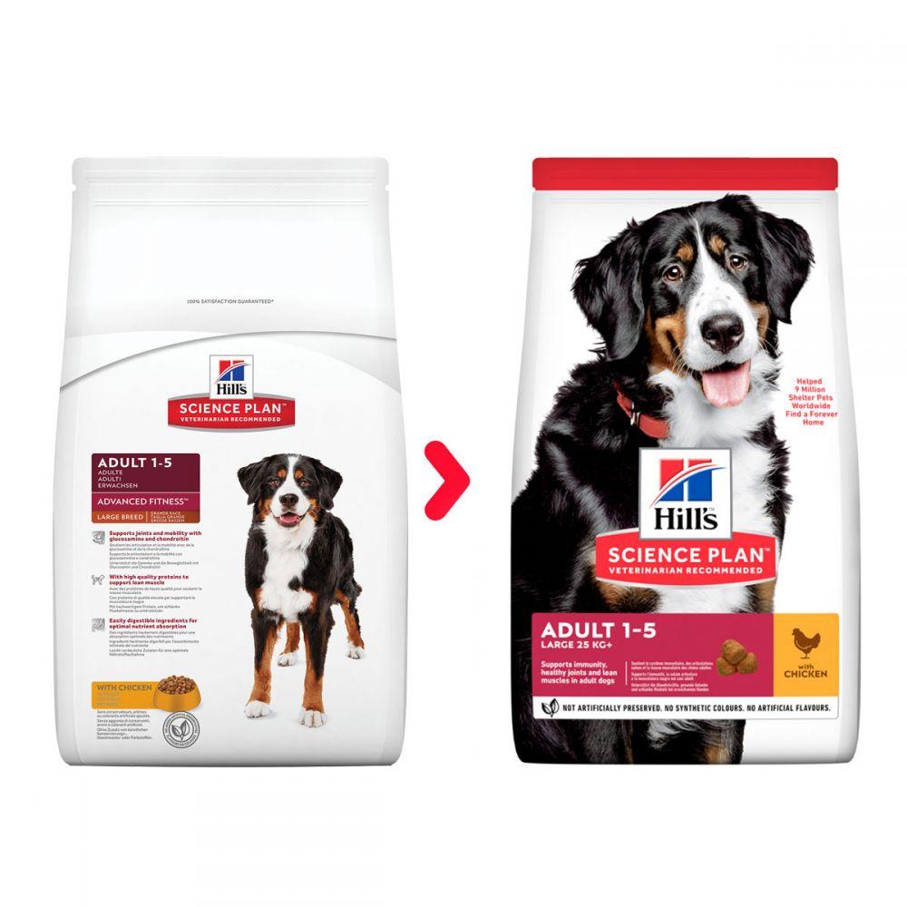 Hill's Adult Large Breed Dog – корм, до складу якого першим інгредієнтом входити справжнє куряче м'ясо, створене на основі сучасних технологій для забезпечення повноцінного та збалансованого харчування, спеціально розробленого для того, щоб досягти видимих змін у поведінці собак великих порід. Натуральні джерела глюкозаміну та хондроїтину є будівельними матеріалами здорових хрящів та суглобів для ідеальної рухливості, а додані витамини, мінерали та поживні речовини забезпечують перевірену на клінічних умовах користь антиоксидантів.