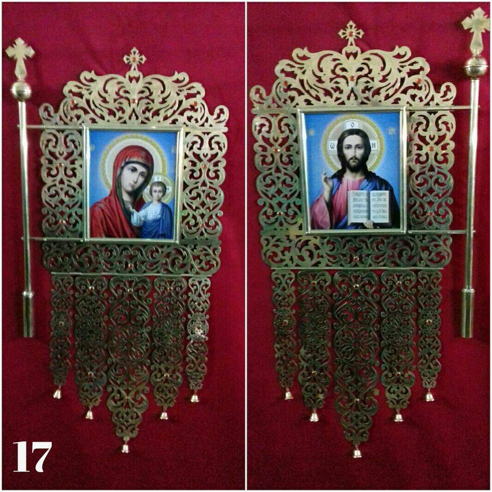 У нашому інтернет-магазині ви можете купити красиві латунні хоругви з образами Господа та Пресвятої Богородиці, а також замовити виготовлення прапорів за власними ескізами. Наші можливості дозволяють виконувати роботи із золоченням, декоруванням камінням, карбуванням, вишитими іконами.
