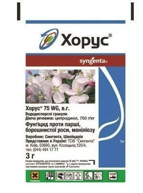 Хорус 75 WG в. г. — надзвичайно ефективний з унікальним механізмом дії фунгіцид проти збудників таких хвороб, як парша, борошниста роса, моніліоз. Крім того, препарат надійно діє при низьких температурах (+5°С), має трансламінарну і контактну дії. Останнє обприскування перед збиранням врожаю суттєво покращує лежкість плодів у сховищах. Знижує втрати від гнилей на 30-40 %. Хорус® 75 WG в. г. надзвичайно ефективний проти моніліального опіку кісточкових (вишня, абрикос, слива, алича, черешня) та кучерявості листя персика. Препарат має високу ефективність проти різних видів гнилей плодів, ягід і винограду. Лікувальна дія — 2 доби, захисна — 10-12 днів. Безпечний для бджіл, корисних комах і довкілля. Належить до малотоксичних препаратів (ЛД50 > 2000 мг/кг). Застосування препарату у фазі розпукування бруньок і рожевого бутона гарантує високу ефективність наступних фунгіцидних обробок.
