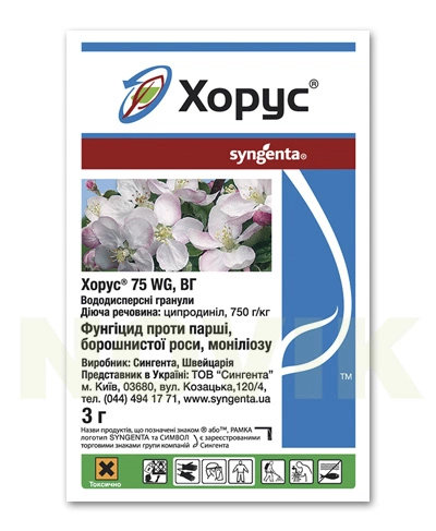 Хорус - эффективный с уникальным механизмом действия фунгицид против возбудителей таких болезней, как: парша, мучнистая роса, монилиоз. Широко используют против монилианольного ожога косточковых (вишня, абрикос, слива, алыча, черешня) и кучерявости листвы персика. Препарат имеет высокую эффективность против разных видов гнилей у плодов, ягод и винограда.