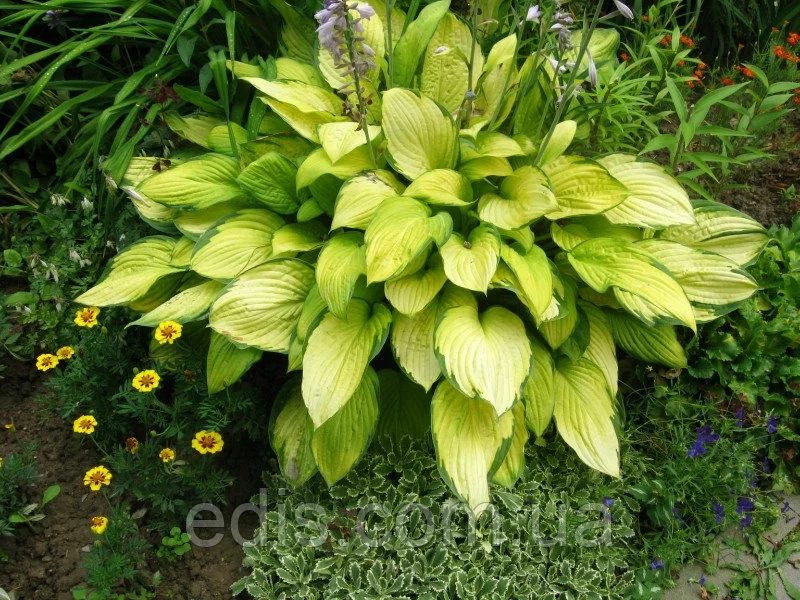 Хоста Форчуна Стандарт Голд Gold Standard в перекладі означає "Золотий стандарт" і ця чудова хоста відповідає своїй гучній назві по кільком параметрам. Взагалі одна з властивостей, за яке я люблю двоколірні хости - це те, що вони постійно змінюються і за цими змінами завжди цікаво спостерігати. Щоразу, приїжджаючи на дачу, я обходжу хости, кланяючись, щоб розглянути, які відбулися зміни за цей тиждень. Але Голд Стандарт змінюється не так, як інші, і це її родзинка. Зазвичай контраст фарб у хост особливо хороша на початку сезону, а потім поступово спадає. Голд стандарт ж, навпаки, - навесні фіолетових трубочок розкриваються нічим не примітні звичайні зелені листочки. Вони, звичайно, симпатичні, але просто зелені. Більш темну вузьку смугу по краю побачиш лише придивившись. Але до кінця травня довгоочікувана метаморфоза стає очевидною - серединка світлішає, спочатку вона просто світло-зелена, потім салатова, поступово стає сонячно-жовта і в липні вже може бути вершково-біла або, як зазвичай цей колір описують модні дачники - "кольору слонової кістки". Особливо швидко ця метаморфоза відбувається, якщо стоїть спекотна погода. Такий ця краса збережеться вже поки її не погубить перший мороз. Тому хоста Голд Стандарт прекрасно підтримає теплу гаму в саду - аквілегії, герані, зелені хости, гейхери і стане відмінним контрастним партнером для блакитних хост. Обережно! Хоста Голд Стандарт порадує вас належним чином, якщо ви її посадіть в тіні крони дорослих дерев (можна навіть у повній густій тіні будов). Її листя дуже швидко втрачають блиск і стають малопривабливого "брудного" жовто-білого кольору навіть, якщо прямі сонячні промені влітку потрапляють на неї лише вранці або ввечері. Опис: Hosta Fortunei Gold Standard Щільна куртина з перекривають один одного листям 102 см шириною x 55 см заввишки (розмір ML). Листова пластинка розміром 20 x 13 см, досить щільна, спочатку шартрезная, потім жовта, а в середині літа - кольору слонової кістки з перьевидной темно-зеленою облямівкою з смугами, доходять до головної (середньої) жилки листа, матова зверху і з сизим нальотом знизу, фактурна (жата), край трохи хвилястий. Лист злегка увігнутий, широкоовальний, з гострим кінчиком (крапельницею) і серцеподібним піднятими або перекриваються частками на підставі листа біля черешка. Черешок шартрезный, з темно-зеленим контуром. Квітка світло-лавандового кольору, з ледь вловимим приємним запахом. Цвіте у липні. От себя ещё могу добавить, что Голд Стандарт выделяется отличным здоровьем и энергией даже среди известных своей неприхотливостью хост в общем Очень устойчивый сорт, спокойно переносит зимние морозы, дожди и засуху. Ничем не болеет, редко повреждается слизнями и улитками - главными и практически единственными наружными вредителями хост. Корень могут подъедать подземные жители - личинка майского жука и т.п., от которых можно "в протравителе замочить корень перед посадкой или раз в 1-2 мес. полить препаратом Антихрущ (или Конфидор)