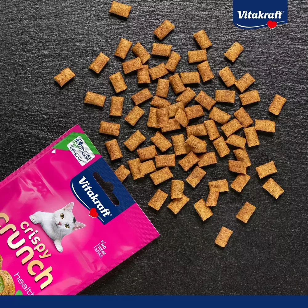 Неймовірно хрустка подушечки зі смачною начинкою – вашому котику сподобаються Crispy Crunch! Ці ласощі запобігають утворенню зубного каменю і підтримують здоров’я ротової порожнини, а олія м’яти перцевої зменшує неприємний запах із рота котика.