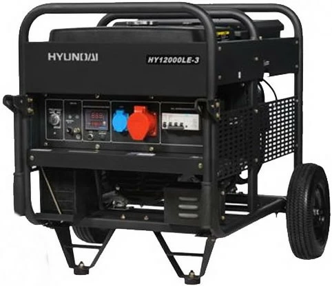 Hyundai HY 12000LE-3 Электрогенератор Модель генератора Hyundai HY 12000 LE-3 профессиональный прибор из серии Professional, осуществляющий производство электрического тока. Электрогенератор укомплектован усиленной рамой, выполненной из стали, двигателем марки Hyundai, имеющим увеличенный моторный ресурс, и виброгасящими основаниями (подушками), обеспечивающими пониженный уровень шума. Дополнительно к генератору предлагается комплект для его транспортировки и пульт дистанционного управления, позволяющий осуществлять запуск прибора на расстоянии в 50 м. Современный бензиновый четырехтактный двигатель с моторным ресурсом более 1500 м.ч. имеет компактную топливную систему и облегченный механизм запуска его работы. Контроль уровня топлива обеспечивается встроенным индикатором. Благодаря увеличенному топливному баку генератор способен работать непрерывно на протяжении 12-ти часов. Наличие в устройстве датчика контроля уровня масла контролирует его расход и предотвращает возникновение режима так называемого масляного голодания, что значительно увеличивает ресурс работы прибора. Работа генератора запускается с помощью поворота ключа. На случай отключения электроэнергии система пуска двигателя способна возобновить работу устройства в автоматическом или дистанционном режиме за счет наличия 12-ти вольтного аккумулятора и стартера. Встроенный регулятор напряжения, самостоятельно осуществляющий постоянный контроль уровня напряжения на уровне 230 Вольт, обеспечивает защиту генератора от короткого замыкания. Контроль тока по четырем основным параметрам осуществляется посредством LED-дисплея. Панель управления укомплектована однофазной и трехфазной розетками, предохранителем и защитой от перегрузок. Генератор оснащен проводами зарядки, позволяющими осуществлять подзарядку аккумулятора. Дополнительно предусмотрена возможность подсоединения к устройству блока автоматики ATS, обеспечивающего автоматический контроль включения и выключения прибора. Запуск работы генератора осуществляется в течение 2-х 6-ти секунд, после чего происходит подача питания на нагрузку. При возобновлении электроснабжения в основном источнике, в автоматическом режиме происходит переключение нагрузки на него, а генератор завершает свою работу. В комплект поставки входит руководство пользователя, доступно разъясняющее правила работы с генератором и регламент работ по его обслуживанию.