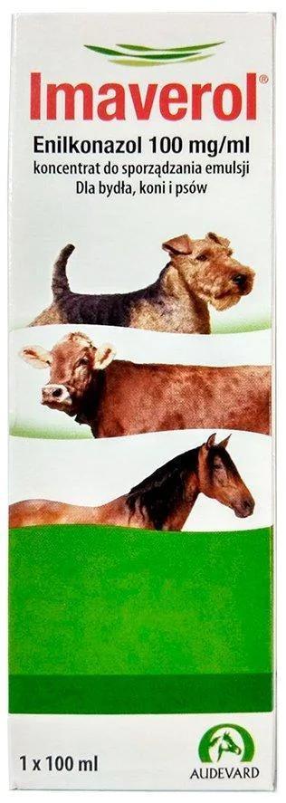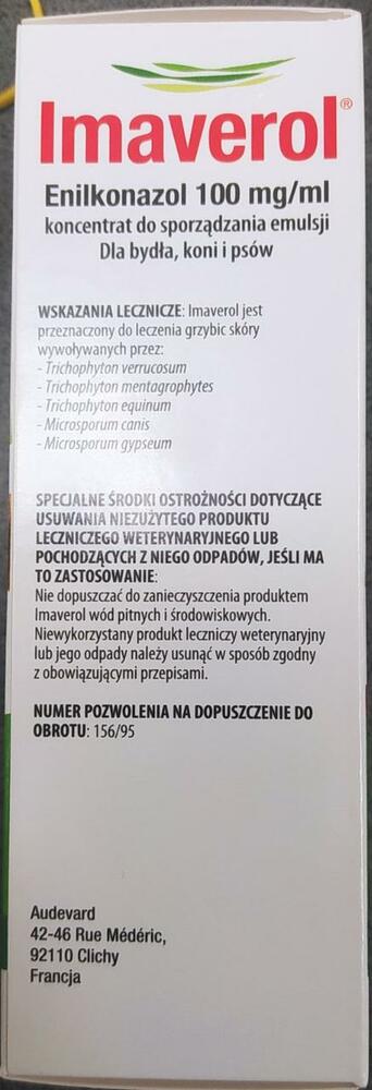 ДОЗИ ТА СПОСІБ ЗАСТОСУВАННЯ: Імаверол застосовують тваринам зовнішньо у вигляді 0,2 % емульсії енілконазолу. Робочу емульсію препарату готують, змішуючи 1 частину імаверолу і 50 частин теплої води. Наприклад, для приготування розведеної робочої емульсії 100 мл імаверолу розбавляють у 5 л теплої води або 1 л препарату розбавляють у 50 л теплої води. Лікування складається з 4 застосувань робочої емульсії з інтервалами в 3 - 4 дні. У важких випадках курс лікування може бути подовжений. Перед використанням препарату ділянки на тілі тварини, забруднені брудом або гноєм, попередньо очищають. Скоринки на тілі тварини видаляють за допомогою жорсткої щітки, змоченої в робочій емульсії препарату. Рекомендується змочувати всю поверхню тіла тварини вже під час першої обробки, щоб ліквідувати невиявлені осередки захворювання. Велику рогату худобу миють, використовуючи обприскувачі, або поливають зі шланга розведеною емульсією з розрахунку щонайменше 1 л робочої емульсії на одну дорослу тварину і 0,5 л на одне теля. У коней уражені ділянки разом із навколишньою шкірою обробляють робочою емульсією препарату. Собакам робочу емульсію імаверолу втирають у шкіру проти шерсті. Собак довгошерстих порід рекомендується попередньо стригти. Можна також повністю занурювати собаку в ємність із робочою емульсією препарату.