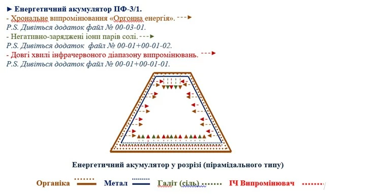 © Енергетичний акумулятор – це мобільний блочно-модульний накопичувач-концентратор пірамідальної форми, який створює внутрішній замкнутий простір для циркулювання створюваних особливих видів енергії, при цьому створюються умови, що поєднують ефекти об'ємного акумулювання енергії, яка не тільки гармонізує внутрішню структуру організму людини але й дуже ефективне цілюще вплив на всі органи людини.