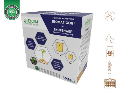 Інокулянт для сої «БіоМАГ Соя» - це двокомпонентний рідкий препарат (інокулянт + екстендер) для передпосівної інокуляції насіння сої на основі культури бульбочкових бактерій Bradyrhizobium japonicum штаму LZ 21 та LZ18-ГМ з титром не менше 5х109 КУО/мл та продуктів їх метаболізму (фітогормони, амінокислоти, вітаміни).