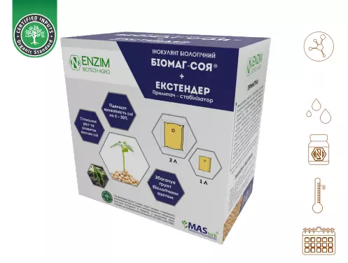 Інокулянт для сої «БіоМАГ Соя» - це двокомпонентний рідкий препарат (інокулянт + екстендер) для передпосівної інокуляції насіння сої на основі культури бульбочкових бактерій Bradyrhizobium japonicum штаму LZ 21 та LZ18-ГМ з титром не менше 5х109 КУО/мл та продуктів їх метаболізму (фітогормони, амінокислоти, вітаміни).