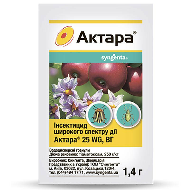 Актара - системний інсектицид нового покоління широкого спектру дії, який характеризуєтся високою ефективністю і прудуктивністю дії ( впродовж 15 хв. після обробки) незалежно від погодних умов і який направлений на захист посадок картоплі, томатів, баклажан, капусти і плодових дерев від багатьох шкідників. Унікальний новий механізм дії виключає розвиток перехресної стійкості до цього препарату.Діюча речовина Актари інтенсивно поглинається рослиною і швидко розноситься до найвіддаленіших точок росту, захищаючи всю рослину.Актара справляє на шкідників шлункову та контактну дію.
