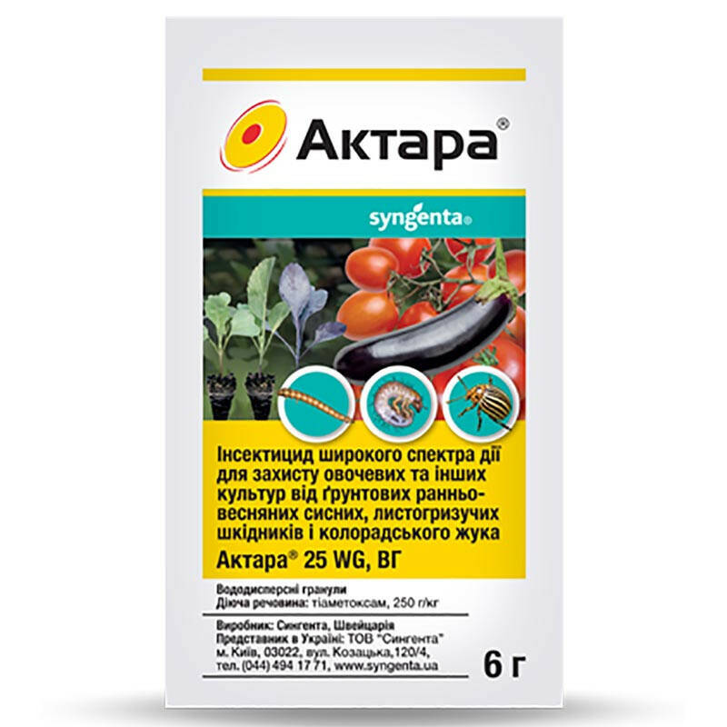 Актара - системний інсектицид нового покоління широкого спектру дії, який характеризуєтся високою ефективністю і прудуктивністю дії ( впродовж 15 хв. після обробки) незалежно від погодних умов і який направлений на захист посадок картоплі, томатів, баклажан, капусти і плодових дерев від багатьох шкідників. Унікальний новий механізм дії виключає розвиток перехресної стійкості до цього препарату.Діюча речовина Актари інтенсивно поглинається рослиною і швидко розноситься до найвіддаленіших точок росту, захищаючи всю рослину.Актара справляє на шкідників шлункову та контактну дію.