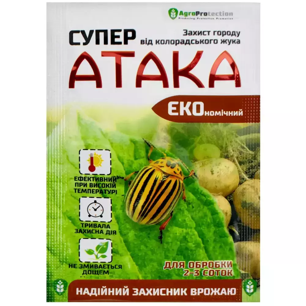 Інсектицидний засіб Супер Атака Еко застосовується для обробки плодових дерев, картоплі та інших овочевих культур з метою знищення колорадських жуків та інших комах-шкідників. У складі даного препарату містяться дві діючі речовини: тіаклоприд та клотіанідин, завдяки яким ознаки ураження шкідників виявляються вже через 20 хвилин після обробки, а повна загибель комах настає через 2-5 годин, при цьому період захисної дії препарату триває до 28 днів. Механізм дії даного інсектициду полягає у блокуванні рецепторів нервової системи, внаслідок чого у комах розвиваються конвульсії та параліч, що призводить шкідників до загибелі. Інсектицидний засіб Супер Атака Еко успішно використовується для захисту картоплі, томатів, баклажан, перцю, яблуні, груші, персика, черешні, винограду, сливи, вишні, абрикоса від колорадського жука, совки, картопляної молі, попелиці, білокрилки, цикадки, довгоносика, листовійки, трипси, рослиноїдних кліщів, плодожерки, квіткоїда, пильщика, п'ядуна.