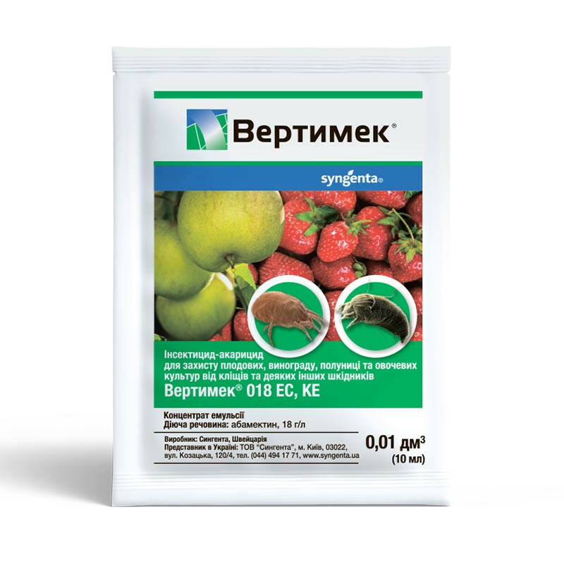 Інсектицид Вертимек - інсектоакарицид кишково-контактної дії для захисту овочів закритого ґрунту, квіткових і кімнатних культур захищеного і відкритого грунту, а також яблуні і винограду від кліщів, трипсів і яблуневої медяниці.