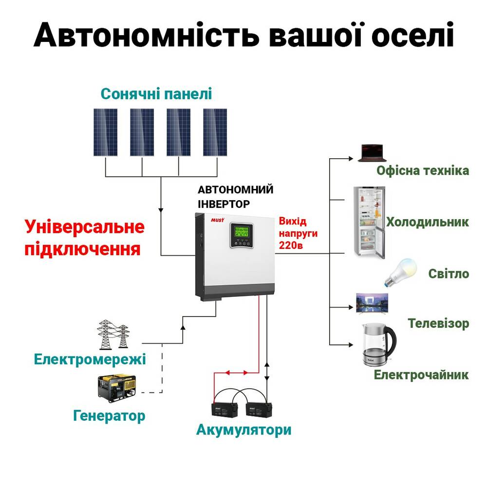 Ізольований інвертор зарядного пристрою Must Solar 1000 Вт 12 В забезпечує вихідну потужність до 1000 Вт від акумуляторів 12 В. Інвертор має вхід для сонячних батарей, який служить для живлення споживання і для підзарядки 12-вольтової батареї. Ця енергія проходить через внутрішній регулятор заряду інвертора зарядного пристрою до 50 А типу PWM і призначена для збільшення заряду акумуляторів, щоб вони були готові до використання. Крім того, до комплекту входить зарядний пристрій на 12 В з потужністю заряджання до 20 А на випадок, якщо нам час від часу буде потрібно підзарядити акумулятори від сумісного генератора або від зовнішньої електричної мережі.