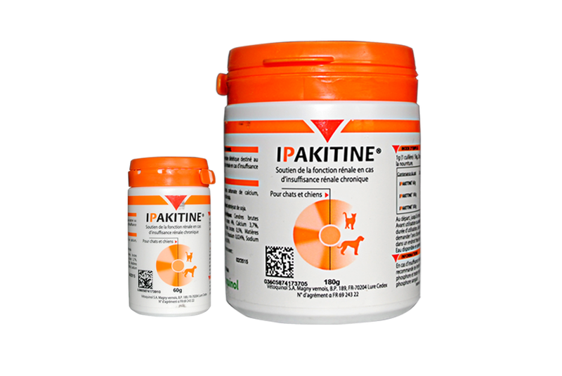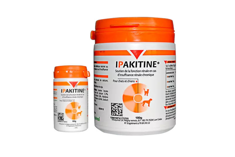 Фармакологічна дія Ипакитине засновано на здатності його компонентів зв'язувати фосфати їжі (карбонат кальцію), знижуючи їх біологічну доступність, і уремические токсини (хітозан). Хітозан відноситься до групи природних полімерів, одержуваних з панцирів ракоподібних. При надходженні хітозану в організм з кормом знижується рівень уремічних токсинів і сечовини в крові, поліпшується функціонування нирок, і за рахунок цього зменшується рівень креатиніну в сироватці крові. Хітозан знижує рівень холестерину в сироватці крові шляхом зв'язування жовчних кислот у кишечнику, підвищує рівень гемоглобіну. В кишечнику хітозан виробляє дію клітковини, переварюючи в мінімальних кількостях, і виводиться з фекаліями у незмінному вигляді. Карбонат кальцію при надходженні в організм утворює міцні нерозчинні сполуки з фосфатами і таким чином коригує рівень кальцію в крові, має алкализирующим дією, що сприяє підтримці оптимального фосфорно-кальцієвого обміну в організмі. Виділяється карбонат кальцію нирками і товстим відділу кишечника.