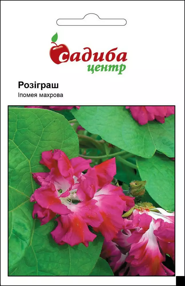 Іпомея Розіграш - оригінальна однорічна в’юнка рослина. Квіти великі, махрові, яскраво-рожеві з білим центром, діаметром близько 8 см. Квітки залишаються відкритими набагато довше, в порівнянні зі звичайними сортами. Довжина стебла – 200см. На розсаду насіння замочують на ніч в теплій воді і висівають наприкінці березня або в квітні по 1 насінині в індивідуальні горщики на глибину не більше 1 см. Посів іпомеї на постійне місце у відкритий грунт проводиться в травні. Сходи іпомеї з'являються на 10-15 день. Це світлолюбна рослина, добре росте на дренованих грунтах. Махрова іпомея ідеально підходить для декорування садових огорож , альтанок,балконів, нею добре затінювати сонячні тераси.