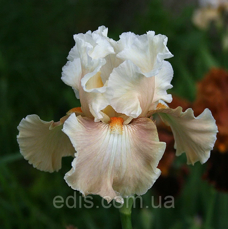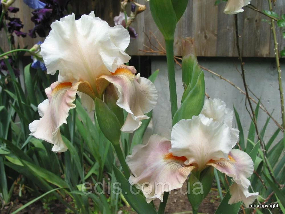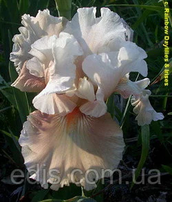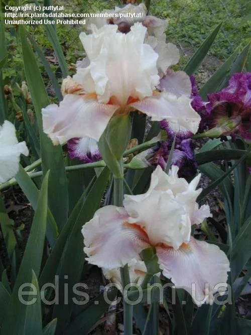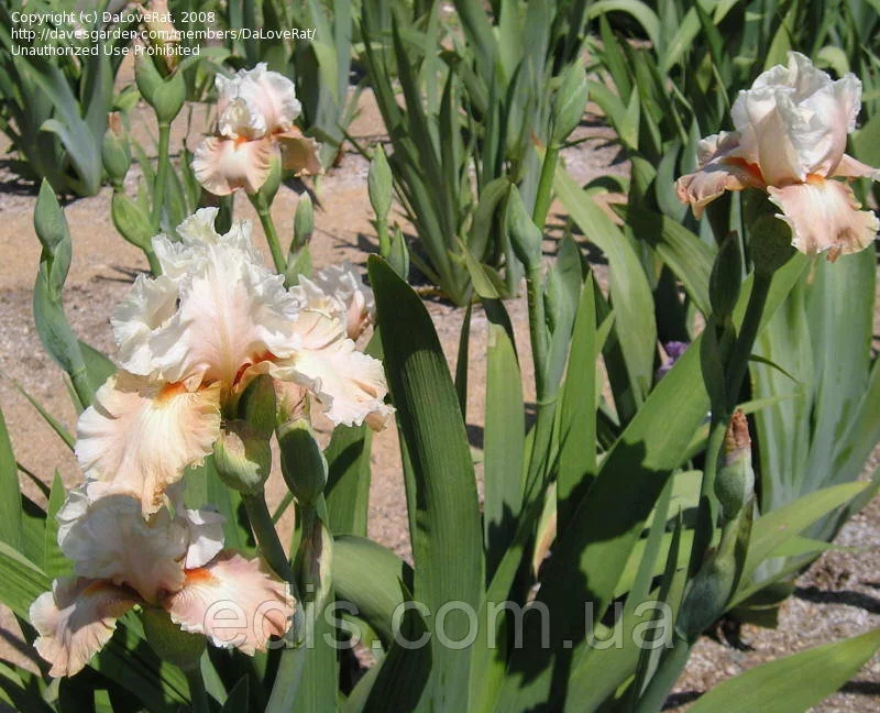 Iris Germanica (Бородатий) Going Номе Назва російською: Гоїн Хоум. Квітка гофрований, стандарти кремові з рожевим свіченням, фоли пастельно-рожеві з більш темним рум'янцем і майже білою люминатой, борідки - яскраво-мадариново-помаранчеві. Висота: 90 див. Термін цвітіння: середній Оригінатор - Блайз, Австралія, 1997.