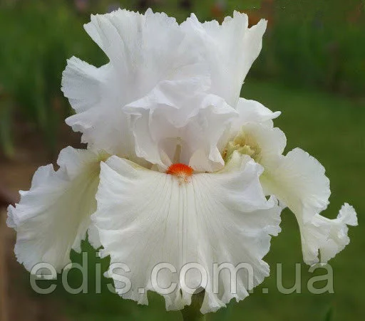 Великий, сильно гофрований, білосніжний красень з яскравою мандариновий борідкою. Безсумнівно, один з кращих білих сортів ірисів!