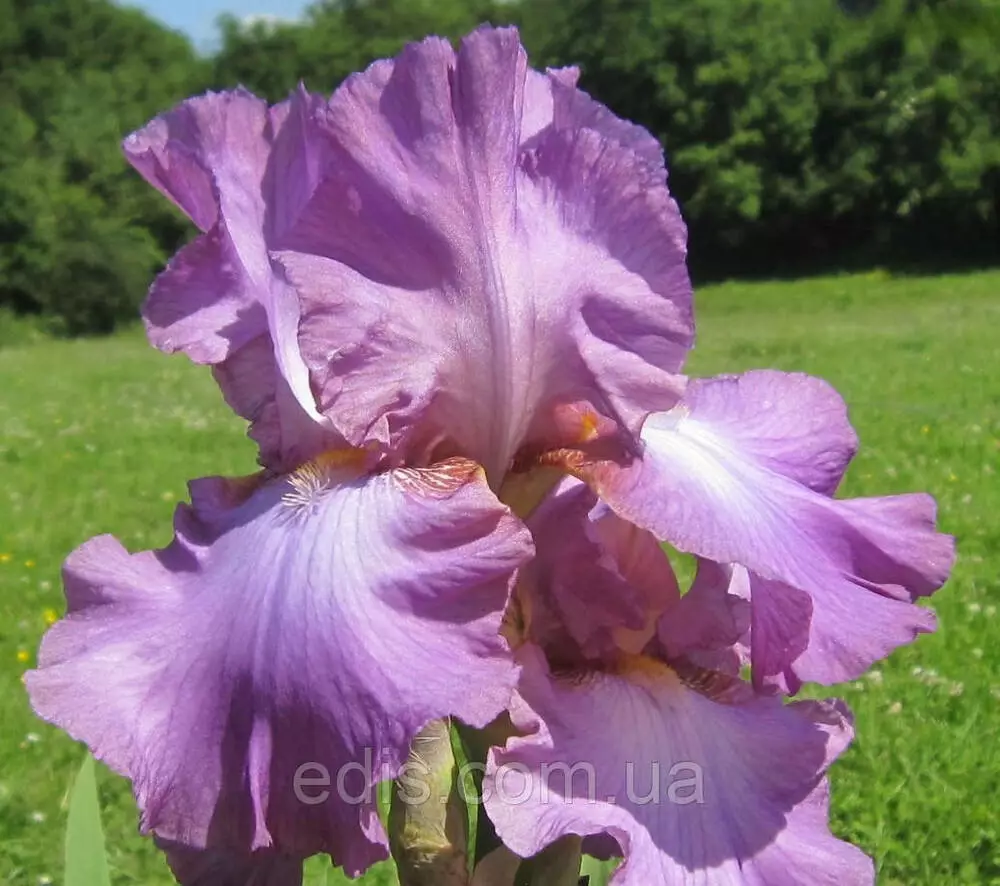 Велика, гофрована квітка приємного орхідейно-бузкового кольору з ліловими прожилками та переливами. Навколо помаранчевої борідки світлий спалах.