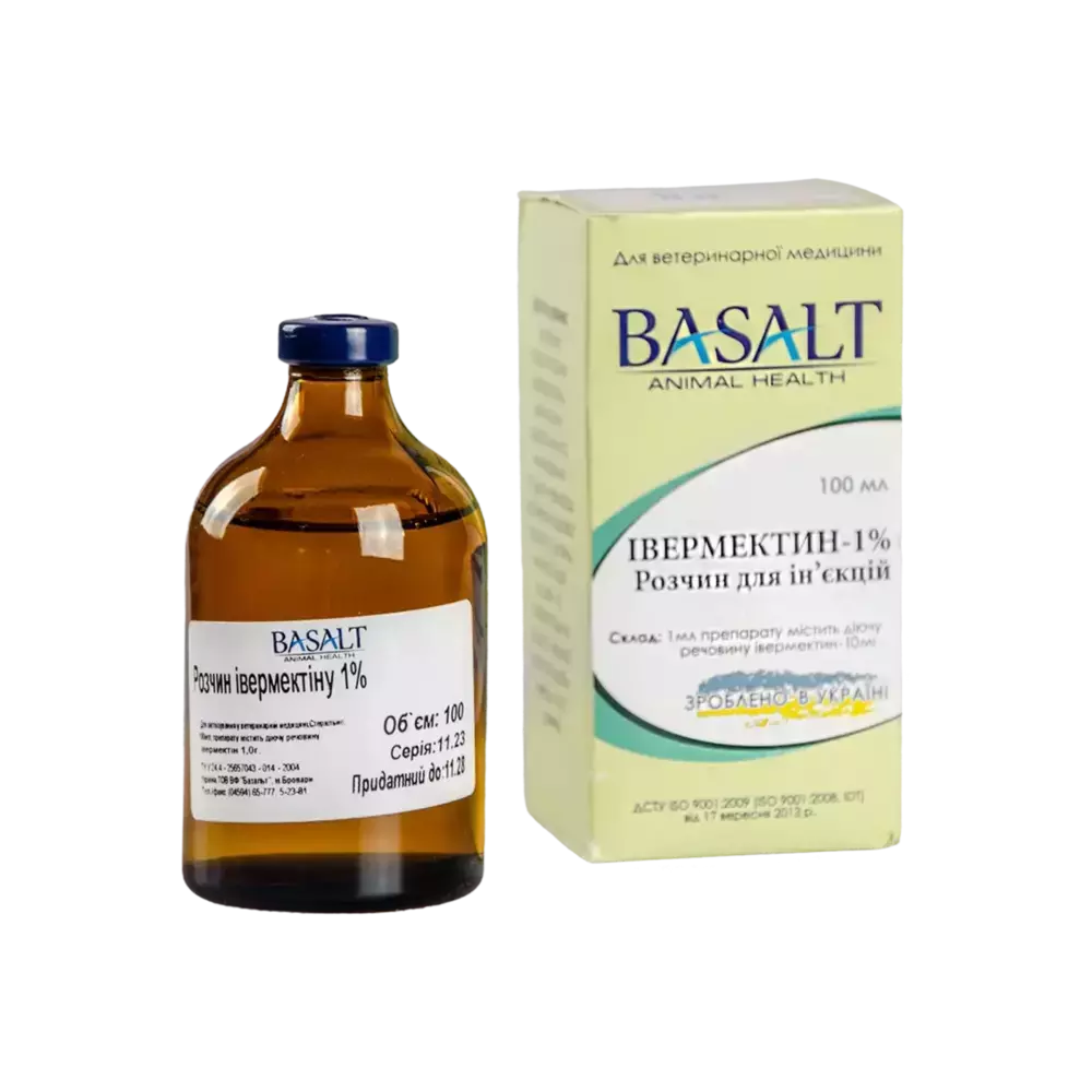 Склад: івермектин 1 г в 100 мл препарату. Фармакологічна дія: івермектин у нематод, павукоподібних, комах та личинок оводів посилює вироблення гаммааміномасляної кислоти, яка як нейромедіатор призводить до паралічу і загибелі паразитів. Застосування: для лікування нематодозів шлунково-кишкового тракту і легенів у жуйних , коней, свиней, собак, кролів і птиці, спричинених усіма статевозрілими нематодами в т.ч. личинок III - IV стадії; телязіозу та парафіляріозу великої рогатої худоби; стефанофіляріозу великої рогатої худоби; короста у тварин усіх видів; нашкірних паразитів (кліщів та ін.); личинок м'ясної мухи; естрозу овець гіподерматозу великої рогатої худоби. Дозування: ВРХ: 1 мл на 50 кг живої маси. Вводити підшкірно в ділянку лопатки. Вівцям: 0,5 мл на 25 кг живої маси, підшкірно. Свиням: 1 мл на 33 кг живої маси, підшкірно в ділянку шиї. Протипоказання та застереження: не обробляти препаратом ВРХ та овець за 21 день до забою на м'ясо. Свиней не забивати протягом 28 днів після введення препарату. Не застосовувати коровам в період лактації, а також за 28 днів до розтелення. Дуже важлива точність дозування для свиней живою масою менше 16 кг. Форма випуску: у флаконах по 1 см3, 5 см3, 20 см3, 50 см3, 100 см3, 200 см3,та ампулах по 1 см3, 2 см3, 5 см3, 10 см3