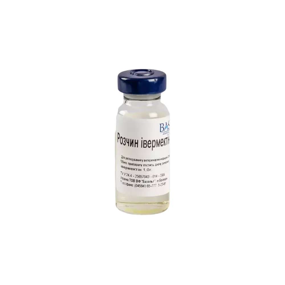 Склад: івермектин 1 г в 100 мл препарату. Фармакологічна дія: івермектин у нематод, павукоподібних, комах та личинок оводів посилює вироблення гаммааміномасляної кислоти, яка як нейромедіатор призводить до паралічу і загибелі паразитів. Застосування: для лікування нематодозів шлунково-кишкового тракту і легенів у жуйних , коней, свиней, собак, кролів і птиці, спричинених усіма статевозрілими нематодами в т.ч. личинок III - IV стадії; телязіозу та парафіляріозу великої рогатої худоби; стефанофіляріозу великої рогатої худоби; короста у тварин усіх видів; нашкірних паразитів (кліщів та ін.); личинок м'ясної мухи; естрозу овець гіподерматозу великої рогатої худоби. Дозування: ВРХ: 1 мл на 50 кг живої маси. Вводити підшкірно в ділянку лопатки. Вівцям: 0,5 мл на 25 кг живої маси, підшкірно. Свиням: 1 мл на 33 кг живої маси, підшкірно в ділянку шиї. Протипоказання та застереження: не обробляти препаратом ВРХ та овець за 21 день до забою на м'ясо. Свиней не забивати протягом 28 днів після введення препарату. Не застосовувати коровам в період лактації, а також за 28 днів до розтелення. Дуже важлива точність дозування для свиней живою масою менше 16 кг. Форма випуску: у флаконах по 1 см3, 5 см3, 20 см3, 50 см3, 100 см3, 200 см3,та ампулах по 1 см3, 2 см3, 5 см3, 10 см3