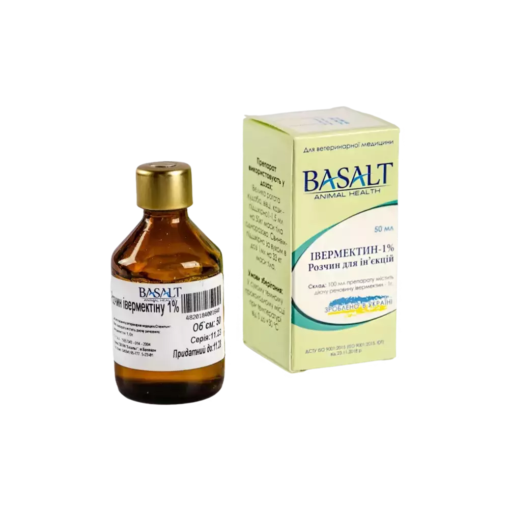 Склад: івермектин 1 г в 100 мл препарату. Фармакологічна дія: івермектин у нематод, павукоподібних, комах та личинок оводів посилює вироблення гаммааміномасляної кислоти, яка як нейромедіатор призводить до паралічу і загибелі паразитів. Застосування: для лікування нематодозів шлунково-кишкового тракту і легенів у жуйних , коней, свиней, собак, кролів і птиці, спричинених усіма статевозрілими нематодами в т.ч. личинок III - IV стадії; телязіозу та парафіляріозу великої рогатої худоби; стефанофіляріозу великої рогатої худоби; короста у тварин усіх видів; нашкірних паразитів (кліщів та ін.); личинок м'ясної мухи; естрозу овець гіподерматозу великої рогатої худоби. Дозування: ВРХ: 1 мл на 50 кг живої маси. Вводити підшкірно в ділянку лопатки. Вівцям: 0,5 мл на 25 кг живої маси, підшкірно. Свиням: 1 мл на 33 кг живої маси, підшкірно в ділянку шиї. Протипоказання та застереження: не обробляти препаратом ВРХ та овець за 21 день до забою на м'ясо. Свиней не забивати протягом 28 днів після введення препарату. Не застосовувати коровам в період лактації, а також за 28 днів до розтелення. Дуже важлива точність дозування для свиней живою масою менше 16 кг. Форма випуску: у флаконах по 1 см3, 5 см3, 20 см3, 50 см3, 100 см3, 200 см3,та ампулах по 1 см3, 2 см3, 5 см3, 10 см3