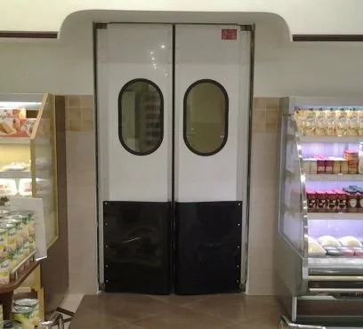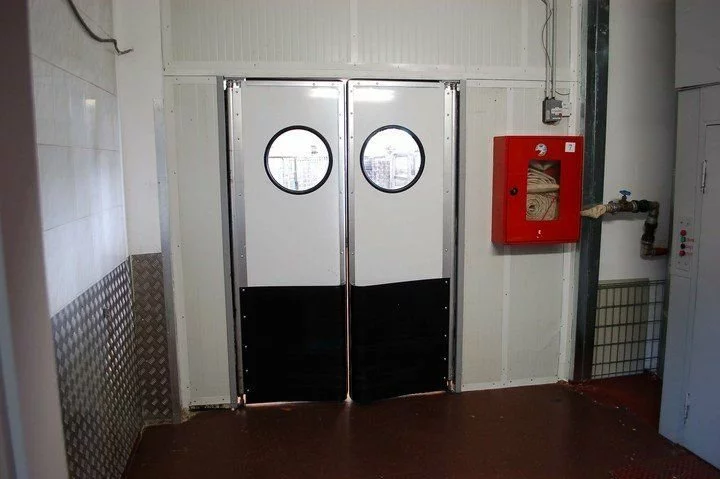Жорсткі Маятникові двері для підтримки стабільного температуро-вологістного режиму в будь-яких приміщеннях. Виготовлені з німецьких сендвіч-панелей (шар пресованого полістиролового пінопласту між двома шарами ударостійкого полівінілхлориду) на алюмінієвому каркасі. Від ударів штабелерами або візками полотно захищають відбійні листи з поліетилену.