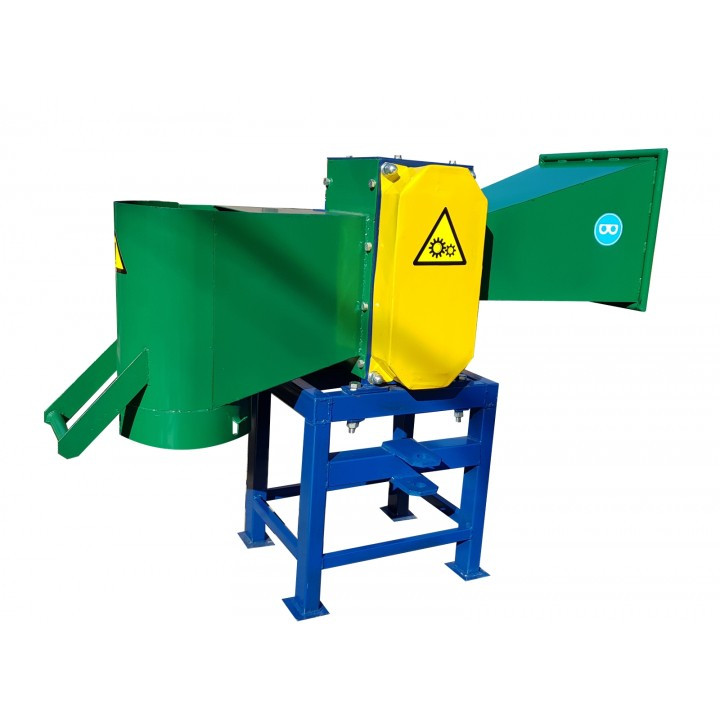 Сама конструкция измельчителя имеет простой но в тоже время очень надежный механизм с 6-тю острыми ножами, которые измельчают ветки на небольшие кусочки от 80 до 170 мм. За час своей работы измельчает до пяти кубических метров дров, что позволяет применять его в промышленных масштабах, будь то лесоповал или запланированные чистки лесополос у дорог, городских парков, домашних участков с большой древесной растительностью.
