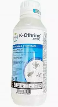 Препарат К-Отрін призначений для професійного проведення дезінсекції. Інсектицидний засіб контактно-кишкової дії K-Othrine SC 50 відноситься за рядом показників до 3-4 класу небезпеки і випускається у пластикових 1-літрових бутлях. К отрин по інструкції придатний до застосування до 2-х років у закритому стані. А приготований робочий розчин необхідно використовувати протягом 8 годин. Склад представляє концентровану суспензію, де міститься дельтаметрин – 50 г/л. Перед тим, як використовувати К Отрін Байєр, необхідно провести тестування на сумісність з іншими засобами обробки.