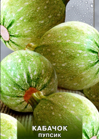 Ранньостиглий сорт кабачка цукіні оригінальної форми. Рослина кущової типу, період від сходів до початку плодоношення 40-45 днів. Плід світло-зеленого кольору з дрібними білими вкрапленнями, круглої форми, у снования слабо ребристий, масою 300-400 г. Шкірочка тонка, м'якоть біла, соковита, насіння дрібні і м'які. Сорт «Пупсик» чудово підходить для фарширування і запікання.