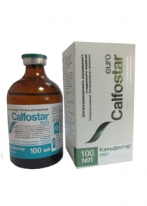 Кальфостар (розчин для ін'єкцій) Опис Прозорий розчин блідо-жовтого кольору. Склад 100 мл препарату містить діючі речовини (г): кальцію глюконат 32,82; кальцію гліцерофосфат 8,13; магнію хлорид 4,18. Допоміжні речовини: кислота борна, натрію цитрат безводний, вода для ін'єкцій. Фармакологічні властивості Кальцій - це важливий мінерал, який утворює кристали гідроксиапатиту в кістках, що надає їм міцності. Іони кальцію регулюють проникність біологічних мембран, забезпечуючи нервово-м'язову провідність. Дефіцит іонів кальцію та тканинних рідин підвищує збудливість нервових вузлів, що може призвести до тетанії. Крім того, кальцій впливає на колоїдний стан білків шляхом зниження їх дисперсії, що призводить до зменшення проникності кровоносних судин. Кальцій стимулює серцево-судинну систему та, при внутрішньовенному введенні, симпатичну частину вегетативної нервової системи, збільшуючи вивільнення адреналіну; наявний у процесі коагуляції крові. Фосфор разом з кальцієм впливає на розвиток кісток та зубів; входить до складу фосфоліпідів, фосфопротеїнів, нуклеїнових кислот та багатьох коферментів. Неорганічні первинні та вторинні фосфати впливають на підтримку кислотно-лужного балансу, відіграють важливу роль у метаболізмі вуглеводів. Аденозину трифосфат бере участь у накопиченні та трансформації енергії в організмі. Магній - це важливий внутрішньоклітинний іон, необхідний для активації багатьох ферментів, зокрема тих, що беруть участь у збереженні енергії у вигляді фосфатних сполук. Магній регулює вивільнення ацетилхоліну з рухових кінцевих пластинок, впливає на м'язову збудливість. Застосування Лікування та профілактика захворювань тварин, пов'язаних з порушеннями метаболізму кальцію, фосфору та магнію: - гіпокальціємія (післяпологовий парез, рахіт у молодих тварин, остеомаляція у старих тварин); - різні форми тетанії (транспортна та пасовищна тетанія, тетанія під час вагітності та лактації); - алергія, токсикоз, післяпологова гемоглобінурія, плямиста хвороба, кропив'янка, екзантема, геморагічний діатез, гематурія та міоглобінурія; - парез внаслідок дефіциту кальцію чи фосфору різної етіології; - допоміжна терапія при отруєннях свинцем, фтором або щавелевою кислотою. Дозування Препарат вводять внутрішньовенно, внутрішньом'язово або підшкірно у дозах: вид тварин доза препарату (мл) спосіб введення коні (масою тіла 500 кг) 80-100 внутрішньовенно велика рогата худоба (масою тіла 500 кг) 80-100 внутрішньовенно, внутрішньом'язово або підшкірно вівці, кози 15-25 внутрішньовенно, внутрішньом'язово або підшкірно свині 15-25 внутрішньовенно, внутрішньом'язово або підшкірно поросята 2-3 внутрішньом'язово або підшкірно За необхідності препарат вводять повторно у таких же дозах через 24 години. Протипоказання Гіперкальціємія, ацидоз, порушення функції нирок, надмірне нервове збудження, фібриляція шлуночків, підвищена чутливість до будь-якого компоненту препарату. Застереження В одне місце внутрішньом'язово або підшкірно можна вводити не більше 50 мл препарату. З особливою обережністю застосовують тваринам із захворюваннями серця, нирок. Внутрішньовенне введення слід робити повільно, щоб уникнути аритмії і серцевої блокади! При внутрішньом'язовому або підшкірному введенні цей ризик є набагато меншим. Не застосовувати одночасно з препаратами диг