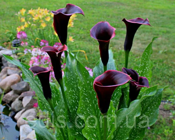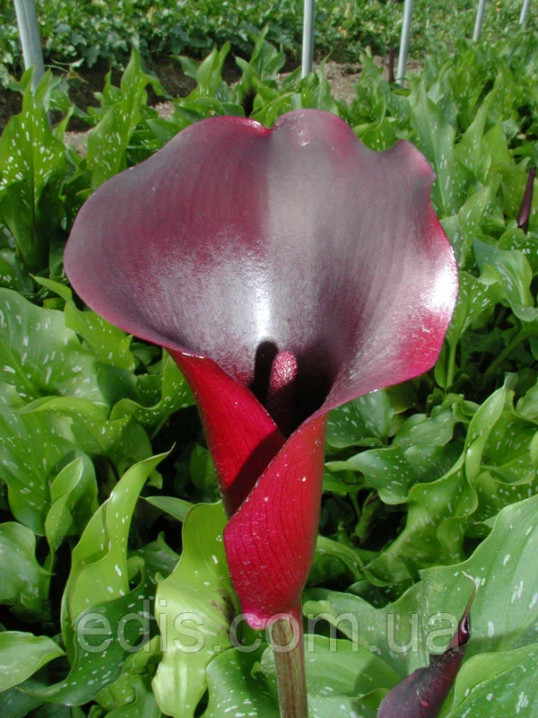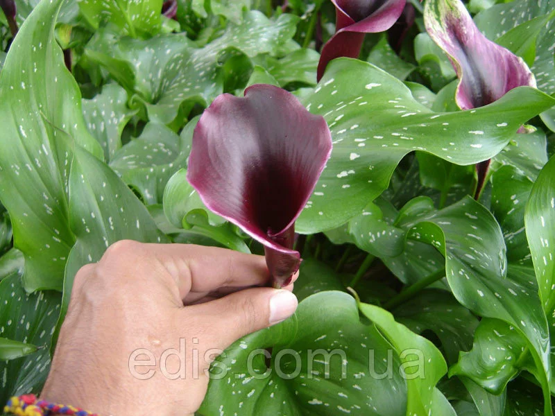 Калла Schwarzwalder Посадка калл цибулинами — це найбільш простий спосіб швидко отримати гарне квітуче рослина. Воліють кали відкриті просторі ділянки та родючі ґрунти, але бажано затінювати їх в найгарячіші денні години. Грунт повинна бути кисла або хоча б слабокисла, потрібен хороший дренаж, тому що застій води в коренях згубний для рослини. Висаджують садові кали на початку травня. Попередньо посадковий матеріал витримують півгодини в розчині марганцівки. Потім бульби занурюють у підготовлені лунки на глибину 5-10 см. на відстані 30-40 см. один від одного (в залежності від розміру цибулини), закопують, а місце посадки добре поливають. Привабливість цієї рослини для квітникарів не тільки в дуже великих ефектних листках і в незвичайній формі квітки, але і в тому, що вирощувати каллу можна як у саду, так і вдома, в горщику. Для цього використовують просторі контейнери або горщики: висотою до 60 см і шириною в радіусі 15-20 см. від точки росту рослини.