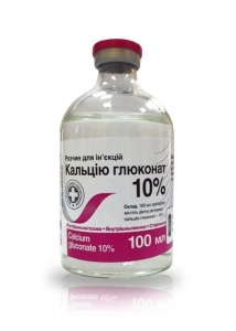 Кальцію глюконат 10% розчин для ін'єкцій Опис Являє собою безбарвну рідина без запаху, Склад 100 мл препарату містить діючу речовину: кальцію глюконат ? 10 г. Допоміжні речовини: вода для ін'єкцій. Фармакологічні властивості Кальцію глюконат відіграє важливу роль в життєдіяльності організму. Він активує ретикуло-ендотеліальну систему і фагоцитарну функцію лейкоцитів, підвищує тонус симпатичної іннервації, стимулює роботу серця. Іони кальцію беруть участь у процесі згортання крові, сприяють перетворенню протромбіну в тромбін. Вони необхідні для формування кісткової тканини, скорочення скелетних м'язів і міокарду. Застосування При кальцієвій недостатності (рахіт, остеомаляція, тетанія). В якості протизапального засобу при пневмонії, плевриті, перитоніті, токсичних ураженнях печінки, паренхіматозному гепатиті, нефриті, токсичному набряку легень, гіперемії і набряку легень, набряку гортані, набряковій хворобі поросят. Як кровоспинний засіб при носових, шлунково-кишкових, легеневих, маткових і післяопераційних кровотечах. В якості десенсибілізуючого засобу при алергічних захворюваннях (астма, сироваткова хвороба, свербіж шкіри, кровоп'ятниста хвороба коней, хронічна кропив'янка у коней і великої рогатої худоби) та алергічних ускладненнях після застосування лікарських засобів. В якості заспокійливого, нормалізуючого нервову систему засобу при вегетаційних неврозах, еклампсії у собак, ацетонемії у корів, паралітичній міоглобінурії у коней. В акушерсько-гінекологічній практиці (при ендометритах, метритах, для стимуляції родової діяльності, прискорення відділення посліду у тварин, попередження абортів, при пологовому парезі, післяродовій гематурії у корів). Застосовують при гіпотонії і атонії передшлунків великої рогатої худоби, геморагічному гастроентериті. Призначають як протиотруту при отруєнні солями магнію, щавлевою кислотою, розчинними солями фтористої і щавлевої кислот. Дозування Препарат вводять внутрішньомязово, внутрішньовенно (повільно) або всередину. Шприц перед наповненням не повинен містити залишків спирту тому, що в присутності останнього глюконат кальцію випадає в осад. Разові дози на одну тварину наступні: велика рогата худоба - 100-200 мл; коні - 100-200 мл; вівці, кози, свині - 50-100 мл; собаки - 20-40 мл Препарат застосовують тваринам 1 - 2 рази на добу. При необхідності курс лікування повторюють через кожні 2 - 3 дні. Протипоказання Гіперкальцемія. Застереження Тваринницьку продукцію після застосування розчину кальцію глюконату 10% можна використовувати без обмежень. Форма випуску Ампули по 10 мл, флакони по 100, 200 мл. Зберігання Зберігати у сухому, темному, недоступному для дітей місці при температурі від 5°С до 25°С. Термін придатності препарату - 2 роки з дати виготовлення. Для застосування у ветеринарній медицині!