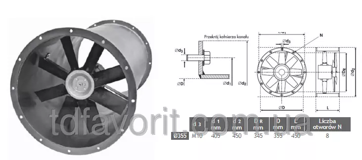 Стандартные осевые канальные вентиляторы Deltafan 355/KAN/10/10/45/230/N предназначены для монтажа в канале в любой позиции. Корпуса канальных вентиляторов изготовлены из высококачественной листовой стали, окрашенной порошком (Размеры круглых фланцев соответствуют норме PN-ISO 13351). Рабочие колёса вентиляторов изготовлены из литьевого полипропилена (PPG), усиленного стекловолокном (лопасти) и литьевым алюминием (втулка рабочего колеса). При более высоких требованиях, касающихся места работы, применяются лопасти, изготовленные из полиамида (PAG), усиленного стекловолокном или алюминием (более высокая термостойкость и прочность). Двигатели вентиляторов асинхронные, однофазные 230В/50Гц или трёхфазные 400В/230В/50Гц. Однофазные двигатели приспособлены к регулированию напряжением скорости вращения, а трёхфазные – к регулированию с помощью преобразователя частоты (инвертора) и в стандартной версии термозащиты. Степень защиты двигателей ? IP 66, изоляция класса нагревостойкости F. Максимальная температура работы для стандартных вентиляторов 60oC.
