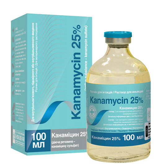 Канаміцин - антибіотик, що належить до групи аміноглікозидів. Він активний щодо грамнегативних та грампозитивних мікроорганізмів: Escherichia coli, Salmonella spp., Shigella spp., Enterobacter aerogenes, Klebsiella spp., деяких видів Proteus spp. та Serratia spp., Pseudomonas aeruginosa, Pasteurella multocida, Staphylococcus aureus, Serpulina hyodysenteriae, Mycoplasma spp. Канаміцин зв'язку язується з 30S субодиницею рибосоми та блокує синтез білків у бактеріальній клітині.
