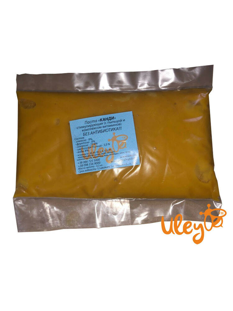 Канді стимулюючі з пилком і комплексом вітамінів має тістоподібну форму і повністю готова для підгодівлі бджіл. Стимулюючі канді виготовлено на основі сахарози та інверсії цукрового сиропу з додаванням пилку (5%) і вітамінів B1, B2, B3, B5, С, А, D, Е, РР, мікроелементів: залізо, калій, кальцій, кобальт, магній, марганець, мідь, молібден, цинк, фтор.