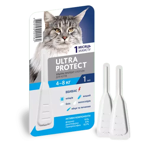 Краплі на холку для кішок Ultra Protect - інсектоакарицидної препарат, який призначений для знищення бліх, іксодових кліщів, вошей і волосоїдів, що паразитують на тваринах, а також для захисту від захворювань переносите паразитами.