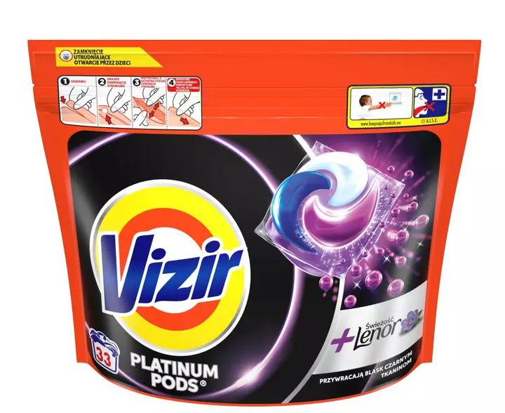 Капсули для прання Vizir Platinum PODS, розроблені для темного одягу, забезпечують очисну здатність Vizir і відновлюють колір чорного одягу, розгладжуючи його волокна. Містить аромат Lenor, який забезпечує надзвичайну свіжість. Капсула POD на 100% розчинна, упаковка підлягає переробці в Польщі.