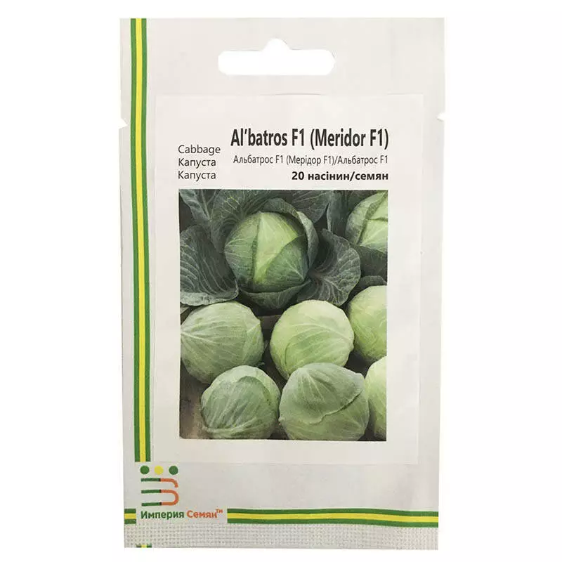Капуста Альбатрос F1 - високоврожайний пізньостиглий гібрид. Період вегетації 140-150 днів від сходів до технічної стиглості. Головки середньої величини, вагою 2,5-3,2кг. Щільна структура, тонкі листки, білосніжний колір, характеризується хорошими смаковими якостями. Великою перевагою гібриду є ідеально круглі вирівняні головки без прожилок. Гібрид стійкий до розтріскування, зберігає свій товарний вигляд після тривалого зберігання (більше 8-ми місяців).