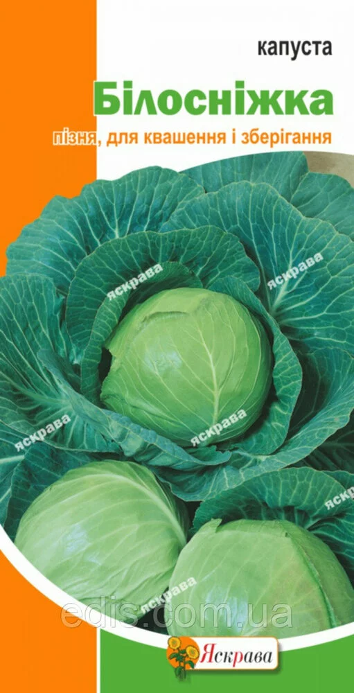 Капуста білокачанна Білосніжка 0,5 г Пригодна для переработки или потребления в свежем виде капуста Белоснежка порадует долгим сроком хранения и хорошим товарным видом даже после длительной транспортировки. Заказать семена с доставкой по доступной стоимости можно в интернет-магазине «Эдис клумба». Мы недорого отправим посылки с товаром по указанному вами адресу – в Одессу, Киев, Львов, Днепропетровск и другие населенные пункты Украины. Капуста Белоснежка имеет такое описание характеристик: головки у нее округлой формы; вес – 2,5-3,9 кг; позднеспелый сорт, который дозревает через 145-160 дней; відрізняється високою врожайністю (4,7–9,7 кг/м2), що особливо вигідно, так як насіння можна купити дешево; низька ціна садивного матеріалу. Сорт дає хороший урожай відмінних смакових якостей. Головки капусти щільні, соковиті, не розтріскуються, придатні для приготування консервації на зиму.