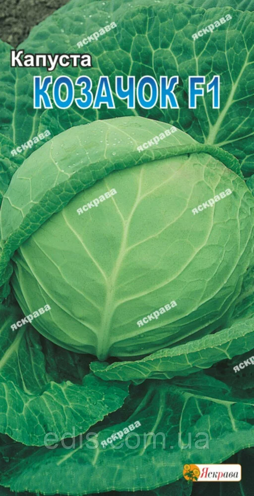 Капуста белокочанная Казачок F1 0,5 г Сорт позднеспелый, 145-160 дней. Высокоурожайный. Головки округлые,очень плотные, устойчивы к растрескиванию, весом до 3,5-4 кг. Окраска сечения белое. Потребляют в свежем и переработанном виде. Сорт пригоден для длительного хранения. Ультраранній гібрид. Вегетаційний період до початку збору врожаю 95-100 днів. Головка округла, масою 1,2-1,7 кг, середньощільна, соковита. Переріз білий з жовтим відтінком. Відмінні смакові якості. Стійкий до ураження хворобами. Холодостійка, волого - і світлолюбна культура, потребує родючих грунтів. Насіння проростає при температурі 2-3°С. Вирощувати розсадою. Висівати насіння на глибину - 1,5-2 см. Висаджувати розсаду у віці 35-40 днів. Позитивно реагує на внесення добрив.