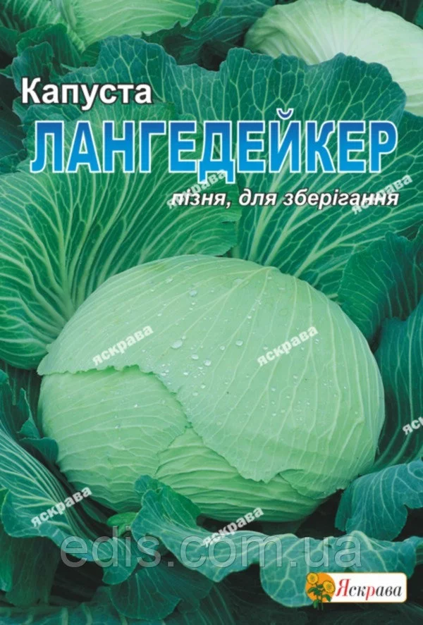 Капуста білокачанна Лангедейкер 10 гПізньостиглий сорт. Голівка овальна, щільна, темно-зеленого кольору, з дуже гарною внутрішньою структурою. Маса головки - 1,5-4 кг. Сорт має хороші смакові якості, стійкий до хвороб, транспортабельний. Призначений для довгострокового зберігання - до травня місяця.