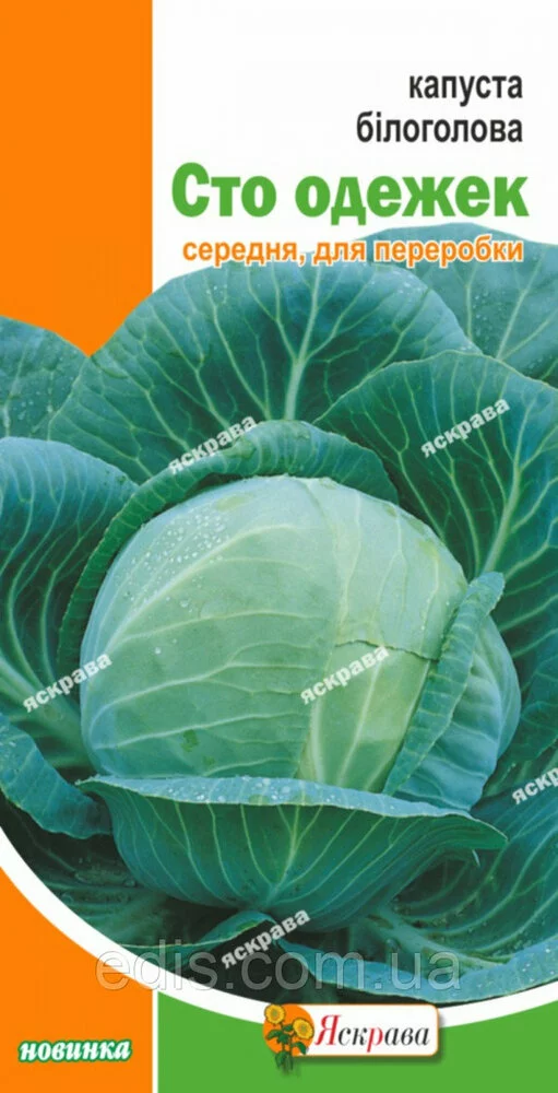 Капуста білокачанна Сто одежинок 0,5 гСередньостиглий сорт. Період від масових сходів до початку технічної стиглості 101-132 дня. Качан середнього розміру до великого, округлий, щільний. Смакові якості високі. Маса качана 2,4-4,5 кг. Дозрівання качанів досить дружнє. Рекомендується для використання у свіжому вигляді і для квашення. Хороші попередники капусти - бобові, огірки, картопля. Висівають на розсаду в другій половині березня. Сходи з'являються через 5-7 днів. До висадки розсада готова через 35-40 днів після появи сходів, коли вона має 4-5 справжніх листків. Розсаду необхідно загартовувати і підгодовувати. Першу підгодівлю проводять у фазі двох справжніх листків,другу - за кілька днів до висадки. У відкритий гунт розсаду висаджують у травні. Посадка за схемою 60х60 см. Догляд полягає в регулярному розпушуванні, прополюванні, рясному поливі і підгодівлі.