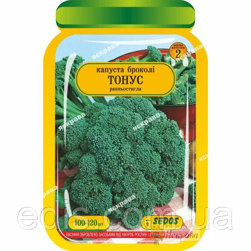 Капуста брокколі Тонус Ранньостиглий сорт. Вегетаційний період від сходів до технічної стиглості 80-90 днів. Головка велика, темно-зелена, середньої щільності, масою 200-250 р. Після зрізу швидко відростає до 7 бокових головок. Врожайність - 1,5-2 кг/кв. м. Сорт цінується за одночасне дозрівання плодів. Використовується в кулінарії, а також для консервування.