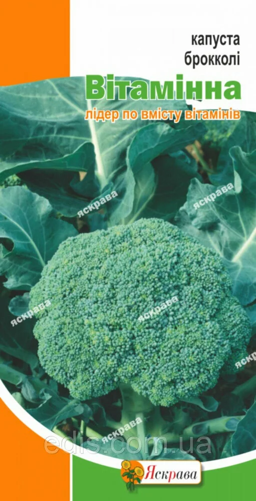 Капуста брокколі Вітамінна 0,5 гСередньостиглий, дружно дозріває сорт. Період від сходів до технічної стиглості 70-80 днів. Розетка в діаметрі 30-50 см, головка темно-зелена, щільна, середнього розміру. Маса головки з основного пагона 150-300 р. Після зрізу стиглих качанів, через 7-12 днів, відростають головки-відростки. Сорт вимагає своєчасного збору, так як голівки швидко рыхлеют. Листя довгі, темно-червоні, зі слабким восковим нальотом, розсічені. Смакові якості відмінні. Сорт володіє стійкістю до фузаріозного в'янення. Рекомендований для заморожування і подальшого використання в домашній кулінарії. Броколі містить абсолютно унікальний комплекс вітамінів і мікроелементів, низькокалорійна. Висівають на розсаду в другій половині березня. Сходи з'являються через 5-7 днів. До висадки розсада готова через 35-40 днів після появи сходів, коли вона має 4-5 справжніх листків. Розсаду потрібно загартовувати і підгодовувати. Першу підгодівлю проводять у фазі двох справжніх листків, другу - за кілька днів до висадки. У відкритий гунт розсаду висаджують у травні. Посадка проводиться за схемою 60*60 див. Догляд полягає в регулярному розпушуванні, прополюванні, рясному поливі і підгодівлі.