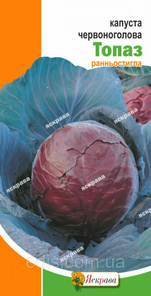 Капуста червонокачанна Топаз 0,5 г Сорт ранньостиглий. Після висадки розсади до збору - 90-120 днів. Розмір рослини середньої. Форма головки овально-округла, до 2-3 кг, дуже щільна, фіолетового кольору, має коротку серцевину. Відрізняється високими смаковими якостями, дієтичними властивостями, а також наявністю великої кількості вітамінів. Застосовують у свіжому і маринованому вигляді, для приготування салатів і гарнірів.