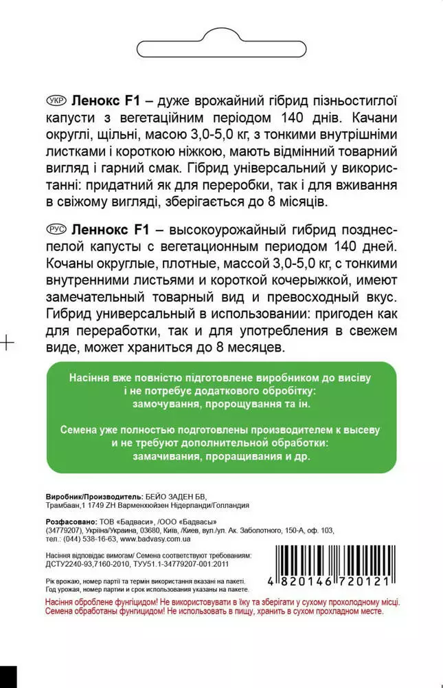 Капуста Ленокс F1, 20 шт, Садиба Центр